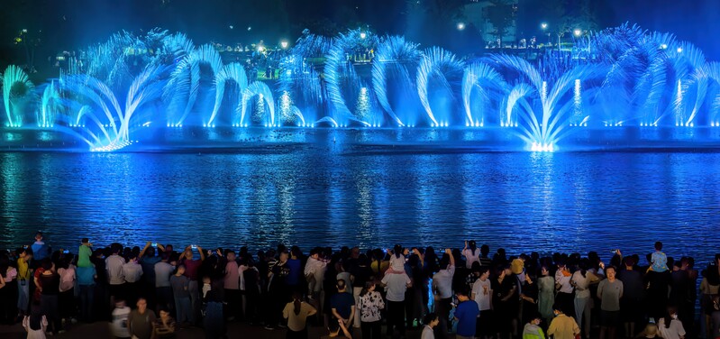 噴泉長80米,寬20米,平面布局采用圓弧相切的設計,共計布置中流砥柱、群峰崢嶸、雷霆萬鈞、芙蓉出水、載歌載舞、霓裳羽衣、萬馬奔騰、千手觀音、 長虹貫日9種水型。主噴最高可達80米,副噴最高可達40米,應用當前領先的氣爆技術、數控搖擺噴泉技術等多種高科技表現的綜合渲染演繹。